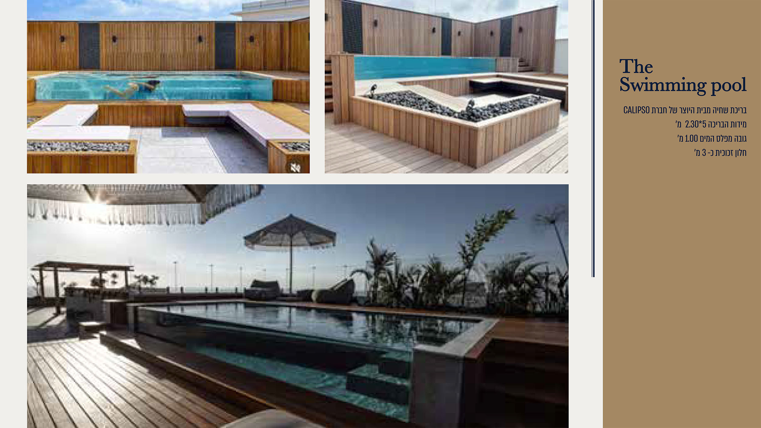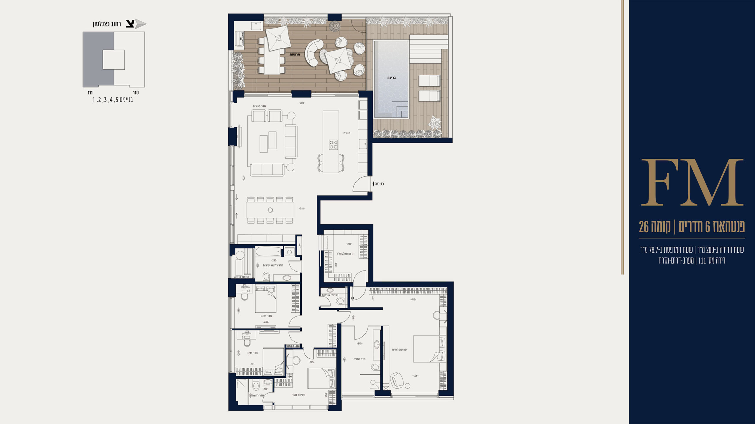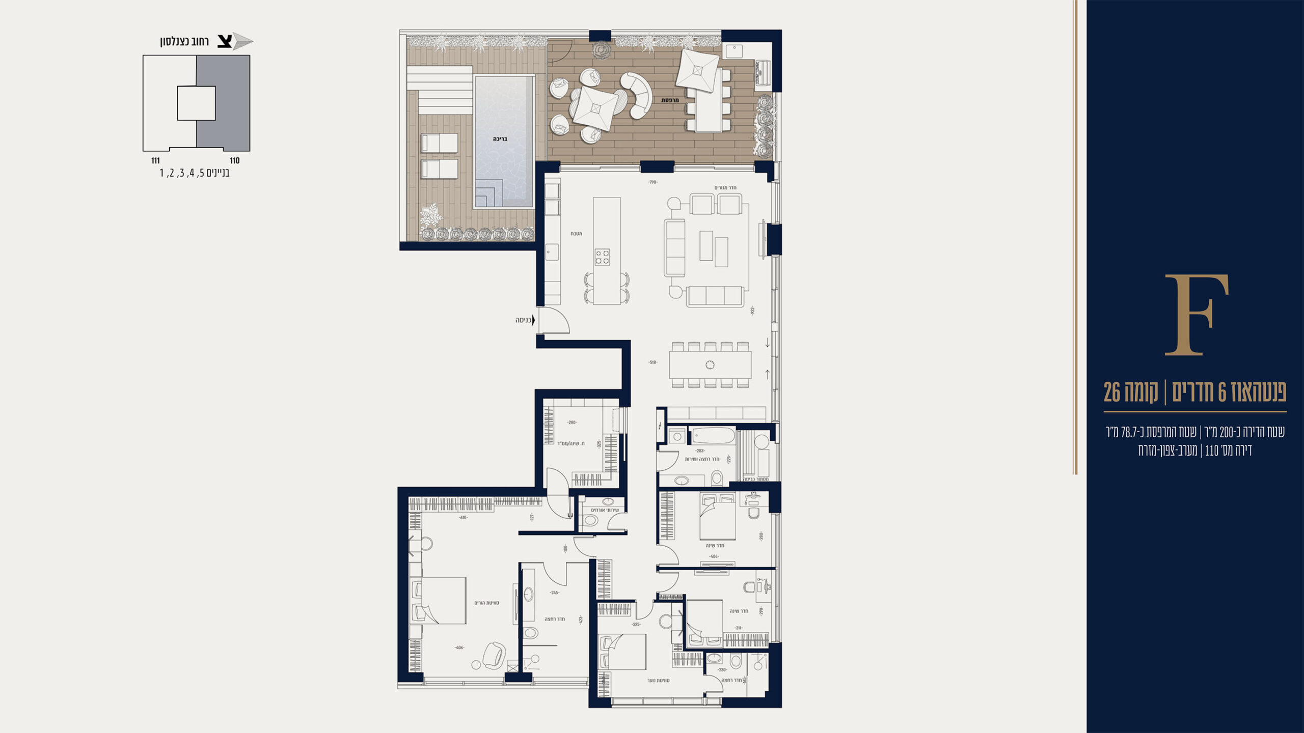 - גודל דירה (במ"ר): מרפסת 78.7 מ"ר עם בריכה פרטית м